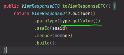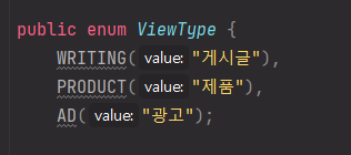 이렇게 되면 위의 ENUM클래스 이미지에 있던 PRODUCT의 벨류값인 "제품"을 DTO로 반환하게 된다.