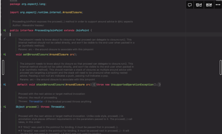 즉, JoinPoint가 가지고있는 모든 메소드를 지원하며 거기에 추가적으로 proceed()메소드가 추가되어있다.